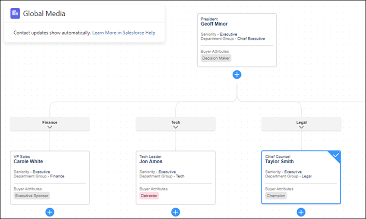 Salesforce: “To show contacts on the map, contacts must have values for Seniority Level and Department Group. To automatically complete these values from your email activity, enable Automatic Contact Enhancements”